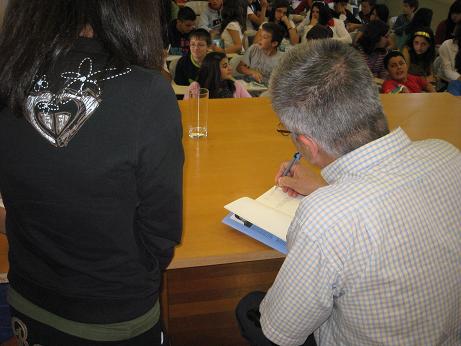 Ao final, cando se acabaron as preguntas, asinounos os libros, fotografámonos con el e prometeunos mirar os nosos cómics na páxina web.