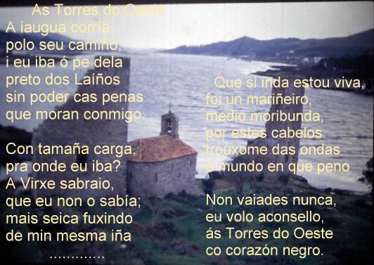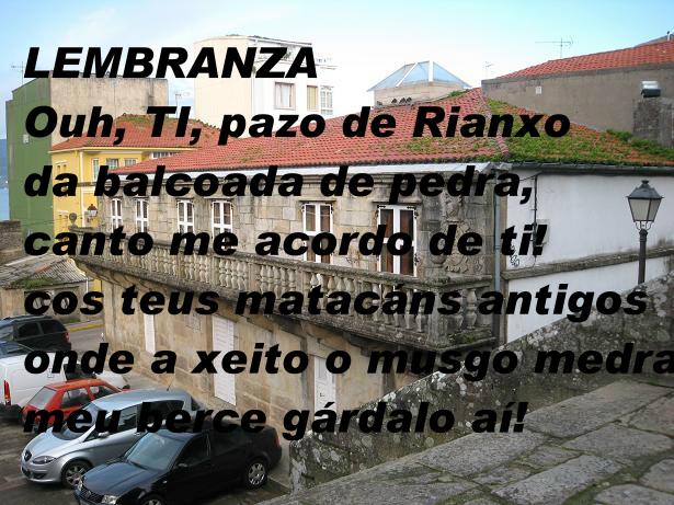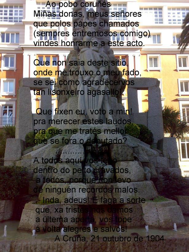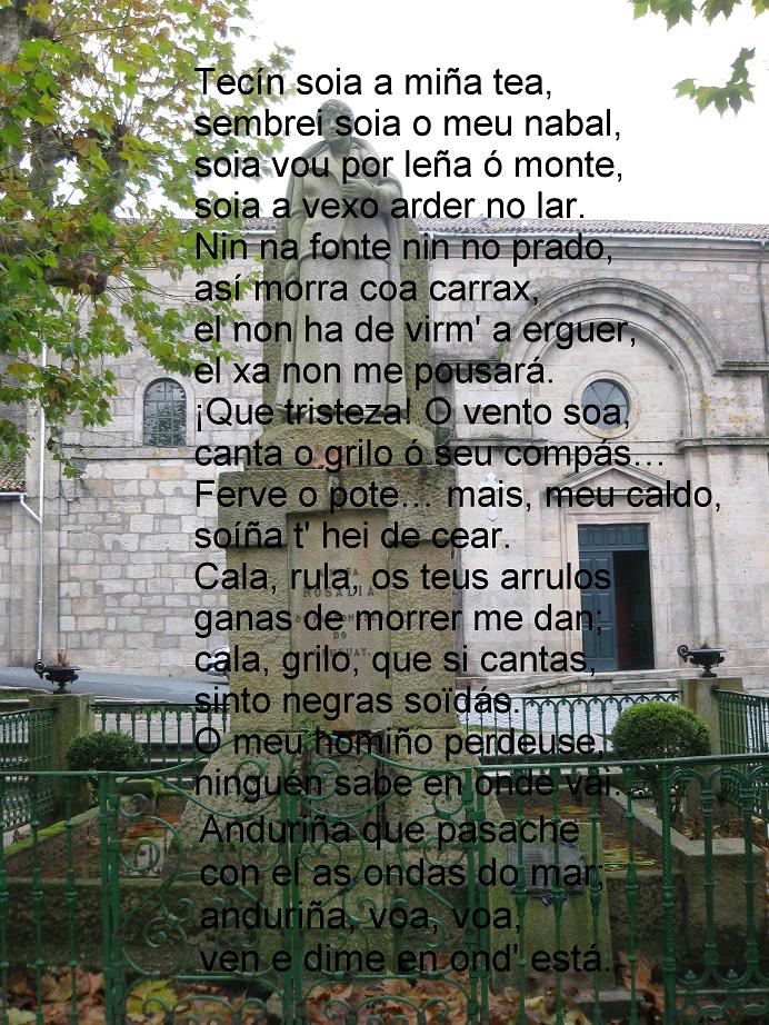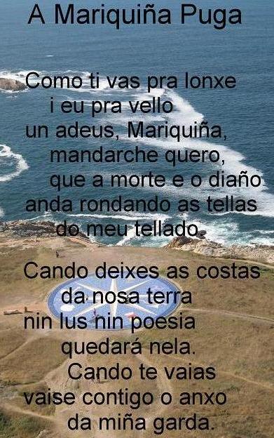 SONETO ACRÓSTICO Queira Deus que esta gaita ben tocada Un recordo lle valla ao bo gaiteiro, E que millenta máis onda o primeiro Veñan tocar tamén a gaita amada. Inda perm ita Deus que sexa soada Voando moi vistoso o meu plumeiro Arrolado cos chíos do punteiro Garrido se mostrando coa alborada Avante vai en todas romerías Levada polas vilas e arredores, Inda sexa mestra de folías. Calada nunca estea, e de primores Inzando os sons preñados, e alegrías, A busquen homes legos e doctores Xoán Manuel Pintos |