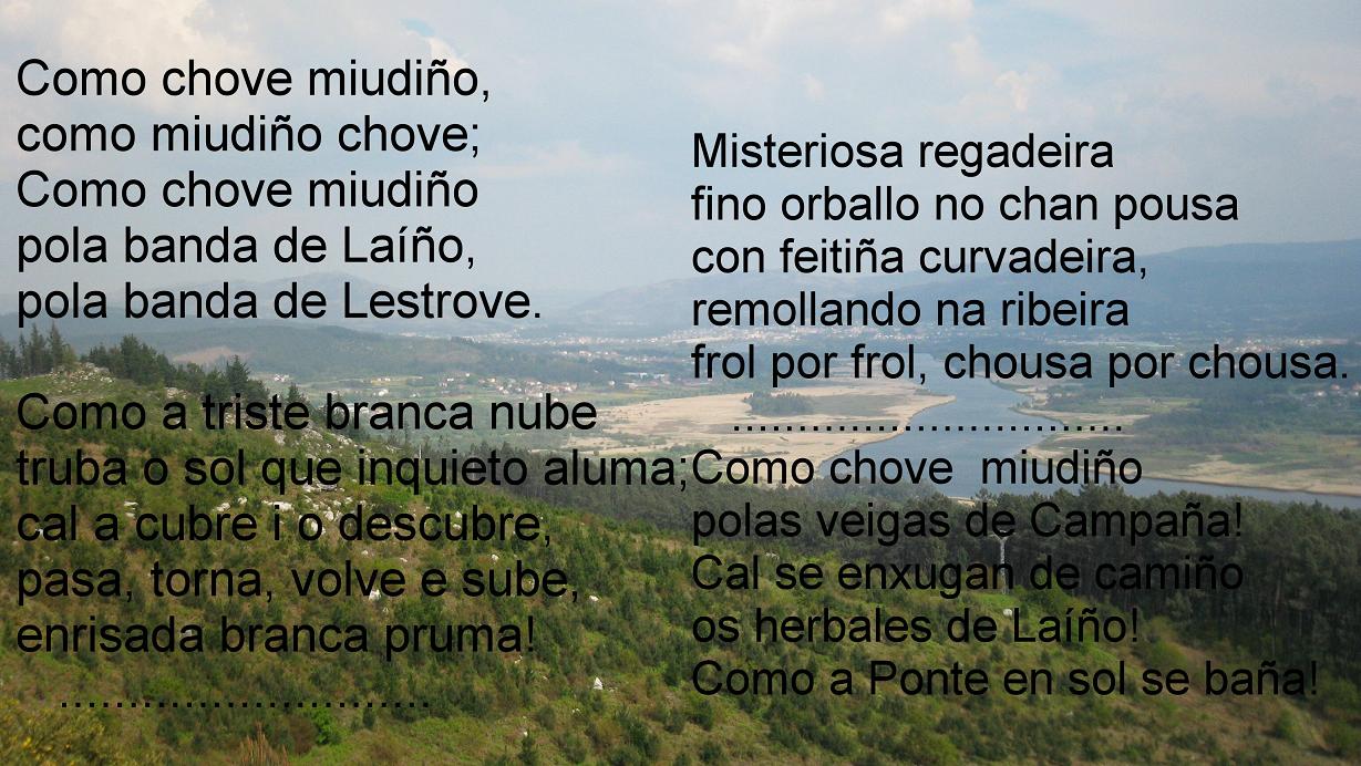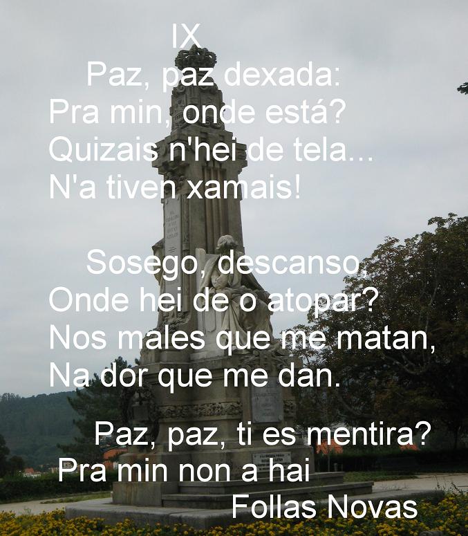 AMOR APRESURADO Mirachesme, mireite, nos miramos; sorricheste, sorrinme, nos sorrimos; nos nosos ollos a nosa imaxe vimos: ti nos meus, eu nos teus nos retratamos. Desde entón de amor nos abrasamos; un mesmo gusto ou pena os dous sentimos, e anque a paraxes diferentes imos, decote no camiño tropezamos. Xa que de corazón libre dispomos, os paxaros dos bosques imitemos, nosa dóce ventura apresuremos. Que o niño fan entre ramaxes e gromos; que a vida é curta e responsable somos do tempo tan precioso que perdemos Francisco Añón |